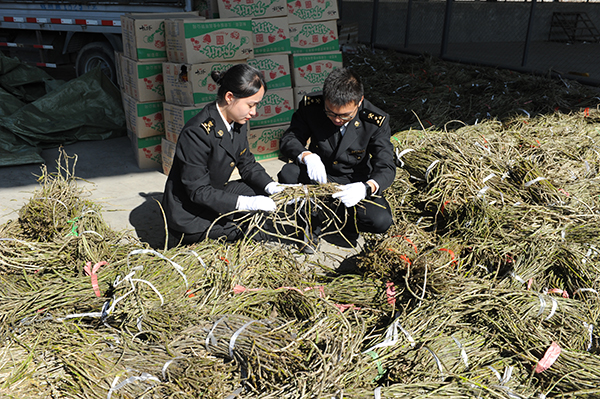 图为:海关关员正在清点查获的石斛 昆关宣/摄